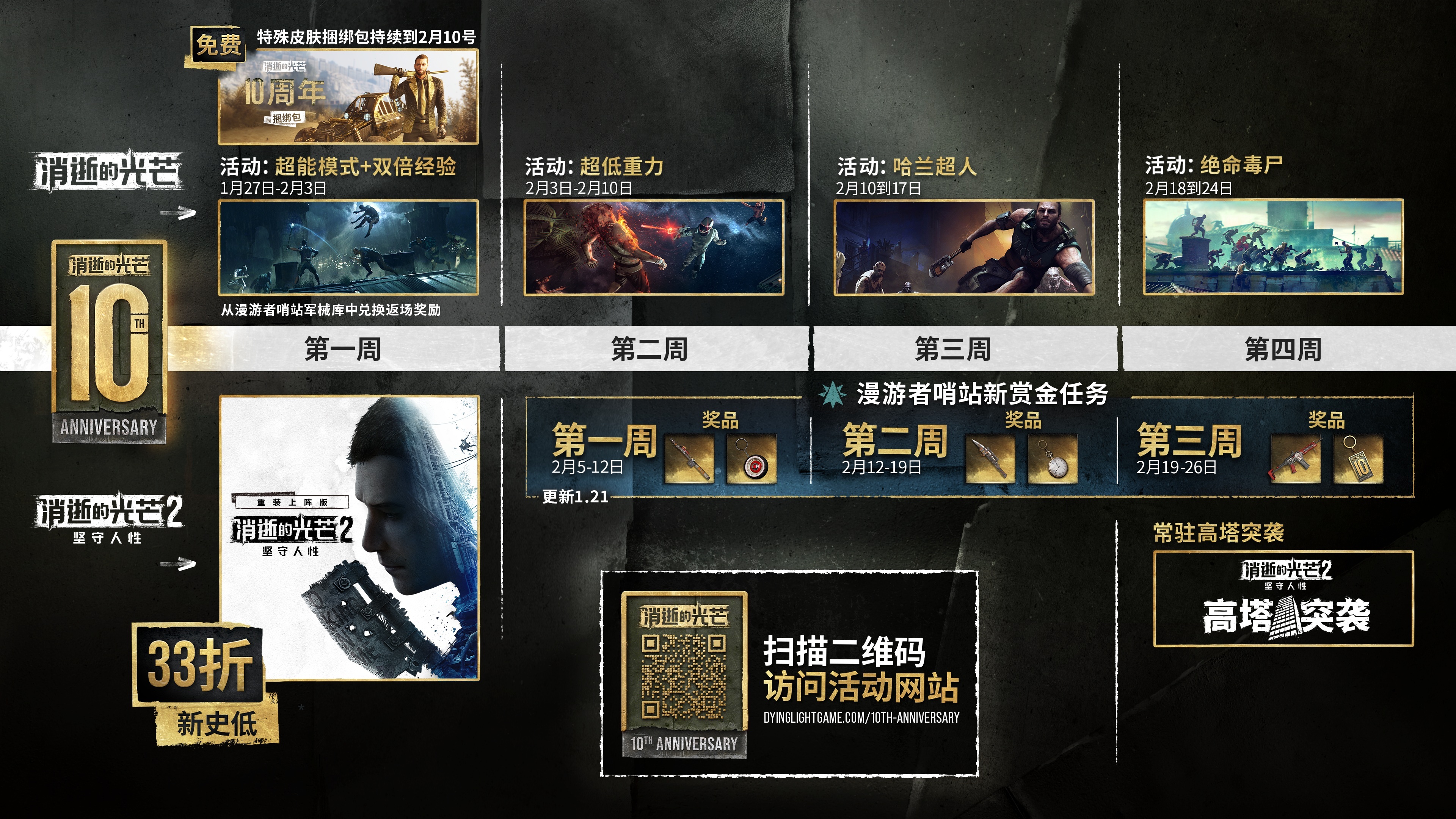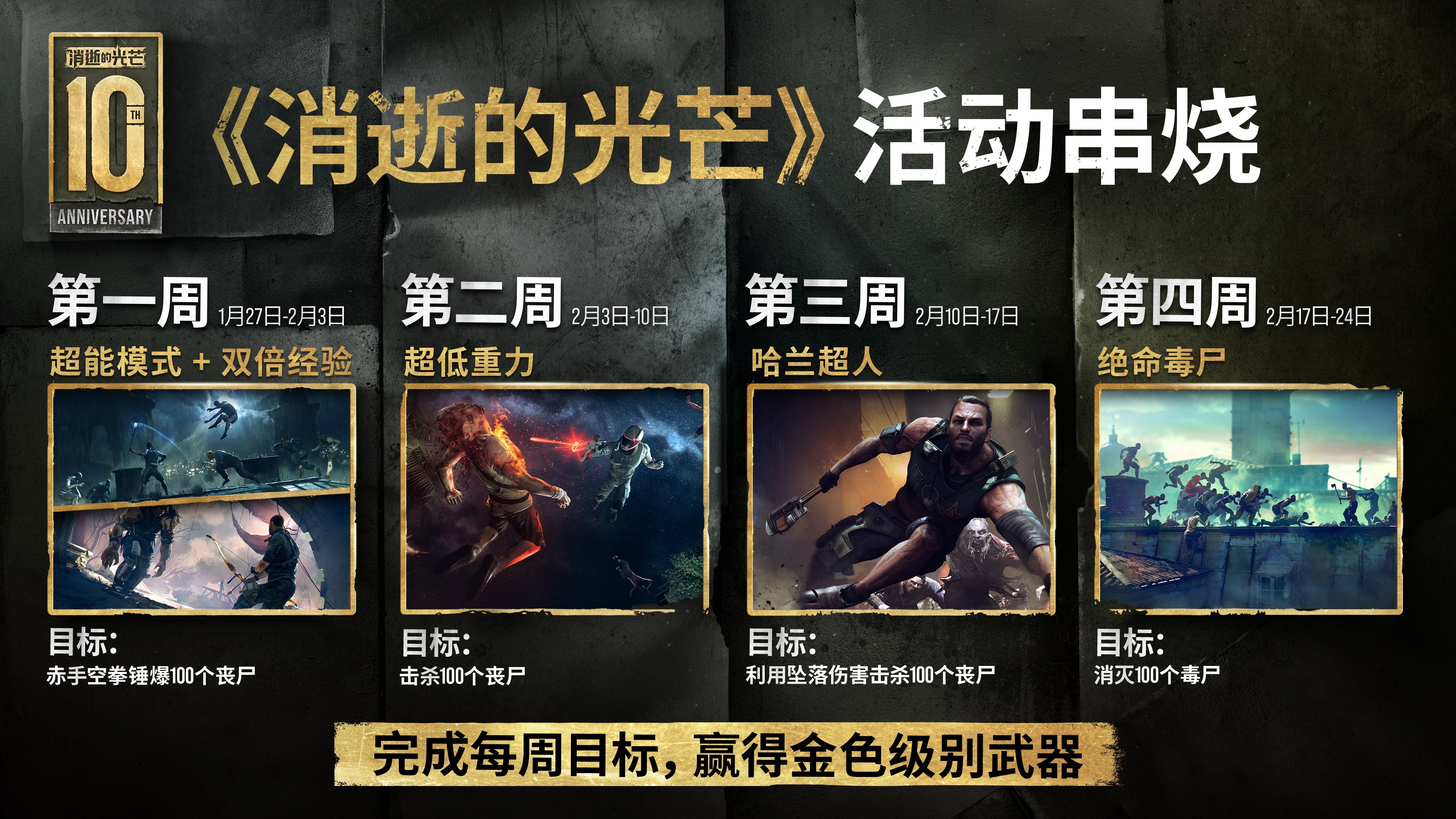 为了庆祝《消逝的光芒》十周年,我们将在接下来的四周内带回玩家最喜爱的活动。现在,你可以体验 超能模式(一拳就能把敌人击飞)以及 双倍经验奖励!