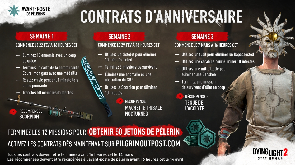 Pour couronner les festivités du 2e anniversaire de Dying Light 2 Stay Human, vous pouvez compléter chaque semaine des contrats d'anniversaire disponibles sur l'Avant-poste de Pèlerin pour remporter des récompenses exclusives comme le Scorpion, la machette tribale nocturne ou la tenue d'acolyte. Les plus anciens fans de la série Dying Light les reconnaîtront. Rendez-vous sur https://pilgrimoutpost.com/events/anniversary-bounties et découvrez comment terminer les contrats pour ajouter ces récompenses à votre planque en jeu.
