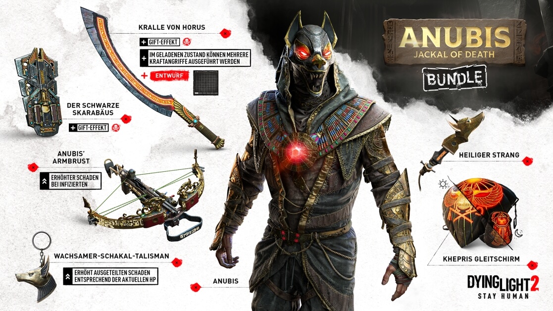 Verachtung sollen sie spüren! Mit dem „Anubis, Schakal des Todes“-Bundle ist es deine heiligste Pflicht, mit der Berührung des Todes das Schicksal deiner Feinde auf ewig zu bestimmen. Diese Gottheit versteht sich nicht nur aufs Einbalsamieren, sondern schneidet auch nur zu gern Feinde auf! Das Set besteht aus uralten Waffen, dem schützenden schwarzen Skarabäus, einem einzigartigen Gleitschirm und noch viel mehr!