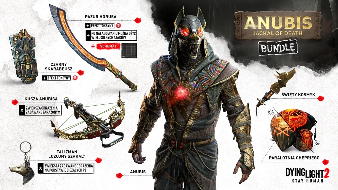 Okaż im pogardę! Wchodząc w posiadanie zestawu „Anubis, Jackal of Death Bundle”, bierzesz na siebie zadanie zapoznania swoich wrogów z dotykiem śmierci i zadecydowania o ich losach na wieczność. Balsamista już ostrzy narzędzia! W zestawie znajdziesz starożytną broń, ochronnego czarnego skarabeusza, unikatową paralotnię i wiele więcej!