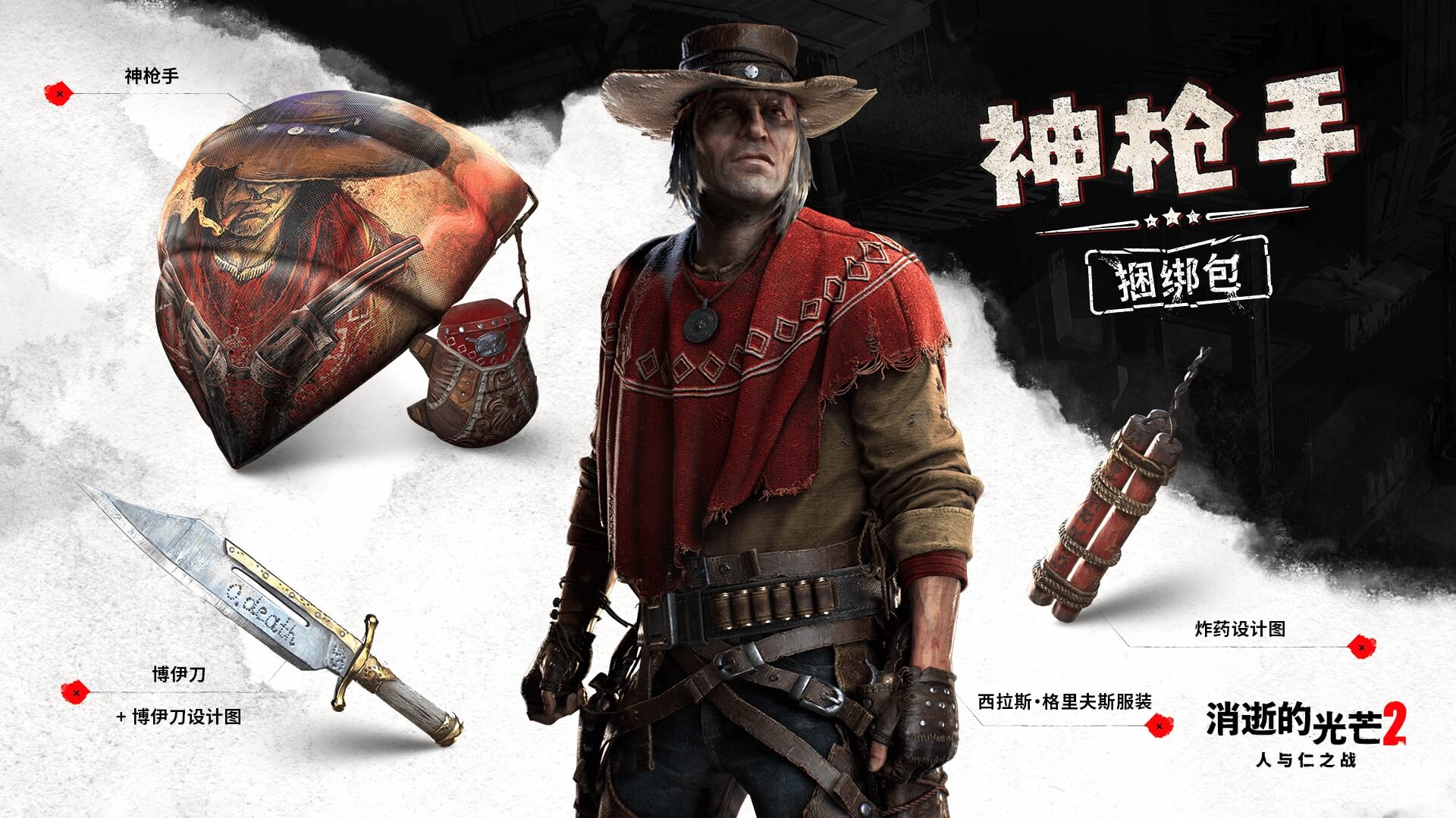 Techland 还将带来更多精选物品,如 西拉斯·格里夫斯服装、神枪手滑翔伞、 炸药设计图以及前文提到的博伊刀及其设计图,一切尽在《狂野西部:枪手》捆绑包 (¥28) 中,这是西部最臭名昭著的亡命徒的上好收藏。
