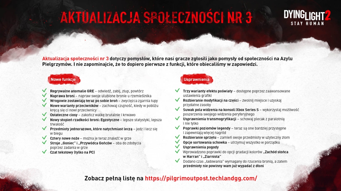 Powraca też wigilia Wszystkich Świętych! Przygotujcie się do polowania na dyniowe przemieńce, zjawowiedźmy i inne, nowe potwory, które pojawią się w grze podczas wydarzenia halloweenowego! Nie mogliśmy też przegapić tej okazji – Pechowy Baka również powraca w wielkim stylu, by pomóc wam podczas upiornych wyzwań! Dodatkowo ocaleńcy w mieście udekorowali swoje kryjówki, więc nie zapomnijcie zrobić sobie pamiątkowego zdjęcia w trybie fotograficznym!