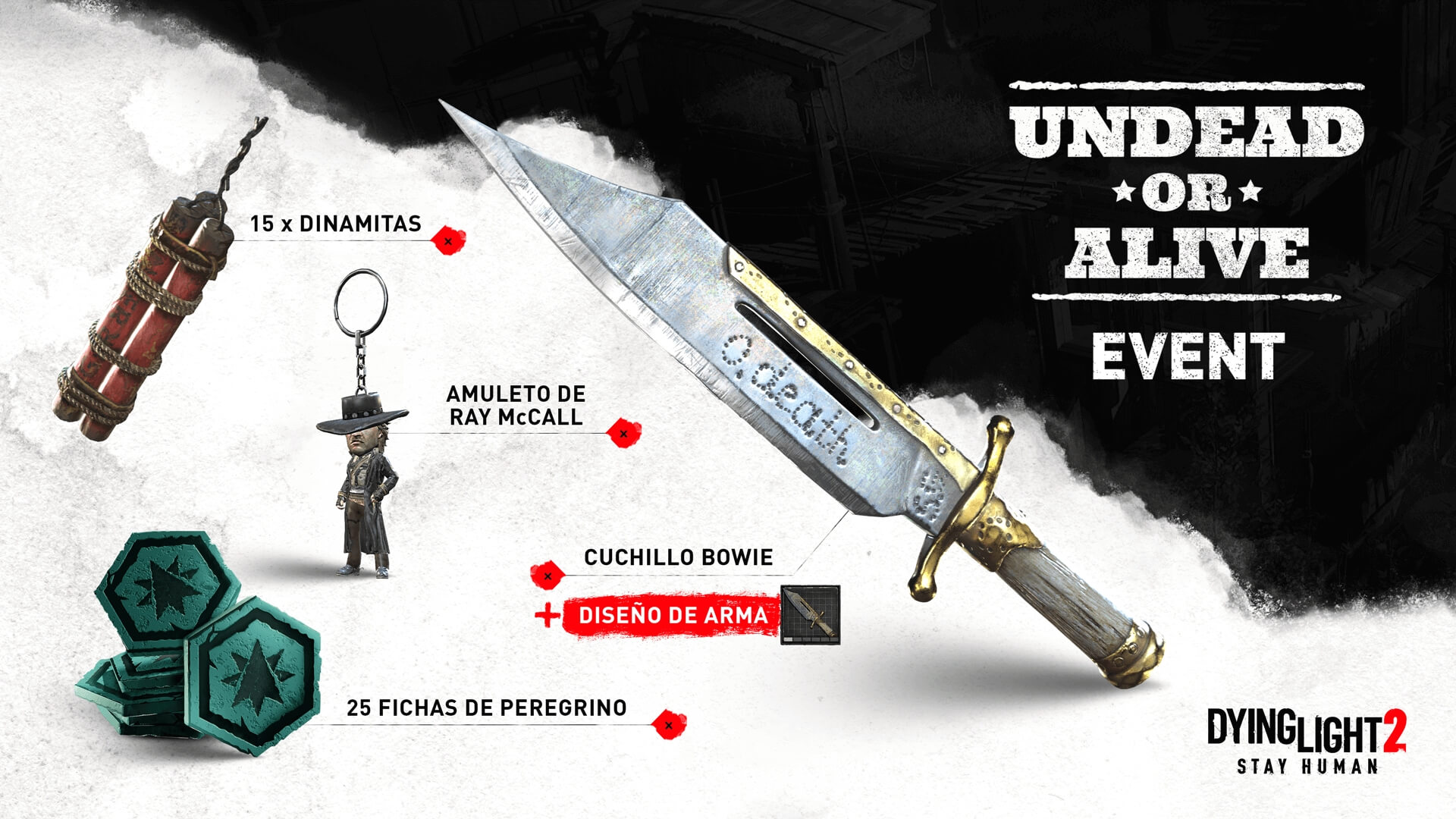 *Hallarás las recompensas personales y de participación en tu alijo al completar el objetivo. Para el objetivo inicial y el objetivo global del Puesto de Peregrinos, entra a outpost.dyinglightgame.com/events. Inicia sesión en tu cuenta para conocer más y obtener las recompensas una vez que completes los objetivos.