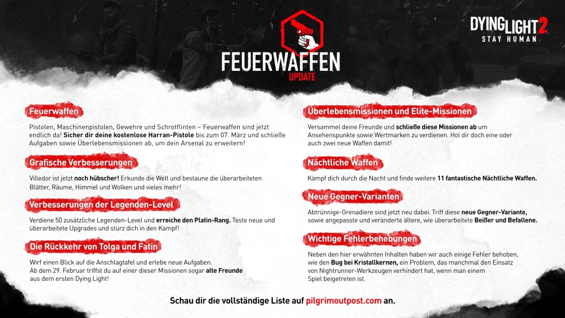 Pilger, ihr wurdet erhört! Mit dem Feuerwaffen-Update fügen wir endlich Knarren zu Dying Light 2 hinzu. Jeder Spieler, der sich vor dem 07. März im Spiel anmeldet, kann sich eine kostenlose Harran-Pistole in seinem Versteck holen! Wenn ihr die Geschichte weiterverfolgen und euch weitere Feuerwaffenbelohnungen verdienen wollt, müsst ihr nur die Quest „Die verschollene Waffenkammer“ abschließen, Jai, den Wächter, treffen und erfahren, wie sie in Villedor wieder aufgetaucht sind. Wir haben vier Waffengattungen für euch vorbereitet (jede mit ihrer eigenen, einzigartigen Munition):