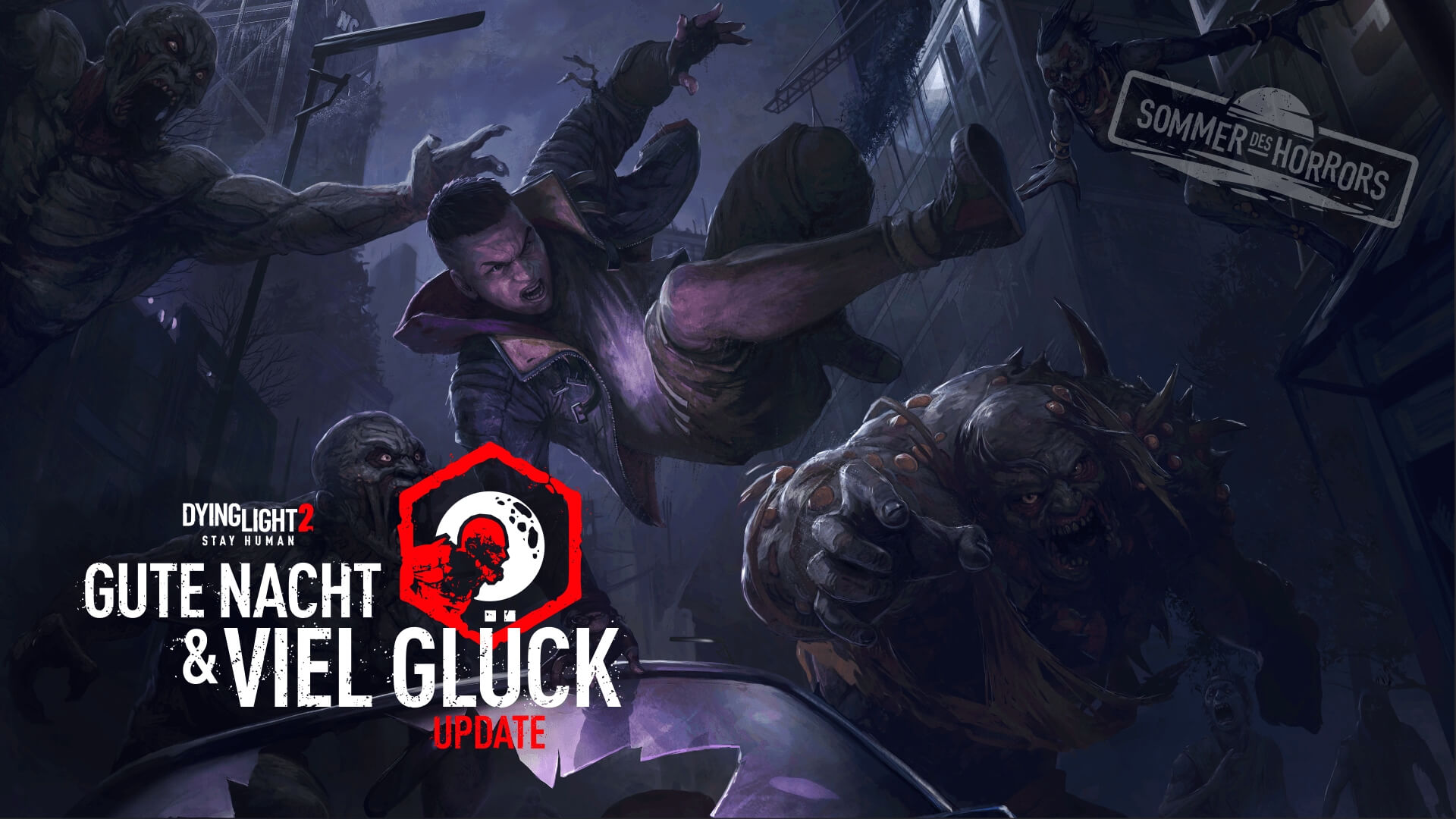 Gute Nacht & Viel Glück ist Teil vom Sommer des Horrors – einer Reihe von Events, Kooperationen und Updates, die uns bis in den September begleiten. Um das zu feiern, laden wir alle Nightrunner ein, sich den Schattenjägern beim Event Blutige Nächte entgegenzustellen; vom 29. Juni 16:00 Uhr bis zum 13. Juli um 16:00 Uhr. Als Belohnung für abgeschlossene Herausforderungen winken 3 Missionstickets der Jägerin (Regulär & Elite), Entwürfe für Armbrust und Bolzen, sowie das Outfit des Arschlochs. Und während des ganzen Events gibt es Dying Light 2 Stay Human mit 50% Rabatt.